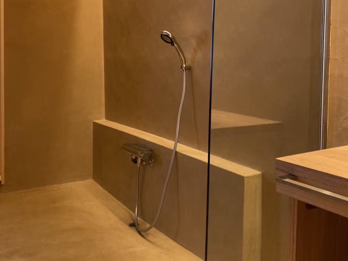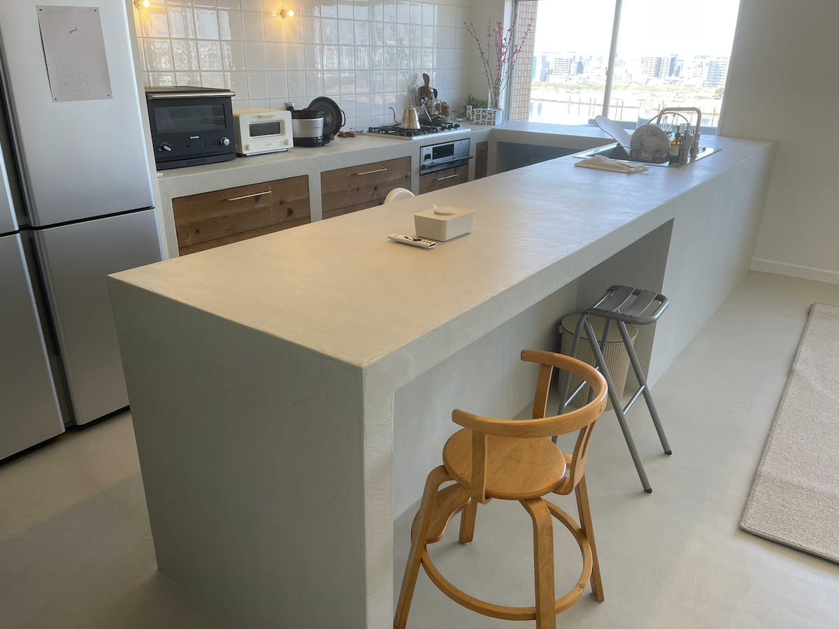 モールテックスは水を通さない、薄く強靭な仕上げ層をつくる左官材料です。そのためキッチンはもちろん、浴室などの水回りでも施工可能です。