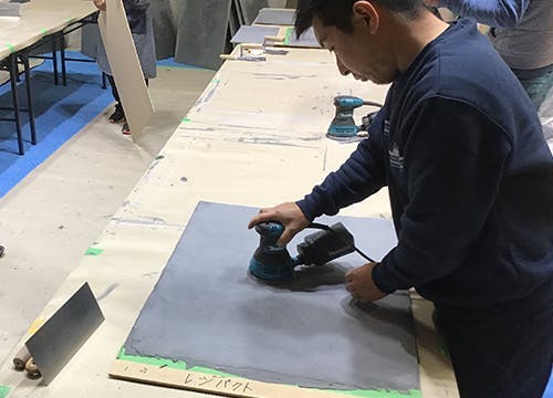 塗布後、48時間以上の養生時間をとったら、サンダーを用いて表面を研磨していきます。(※使用するペーパー番手は#120程度。)